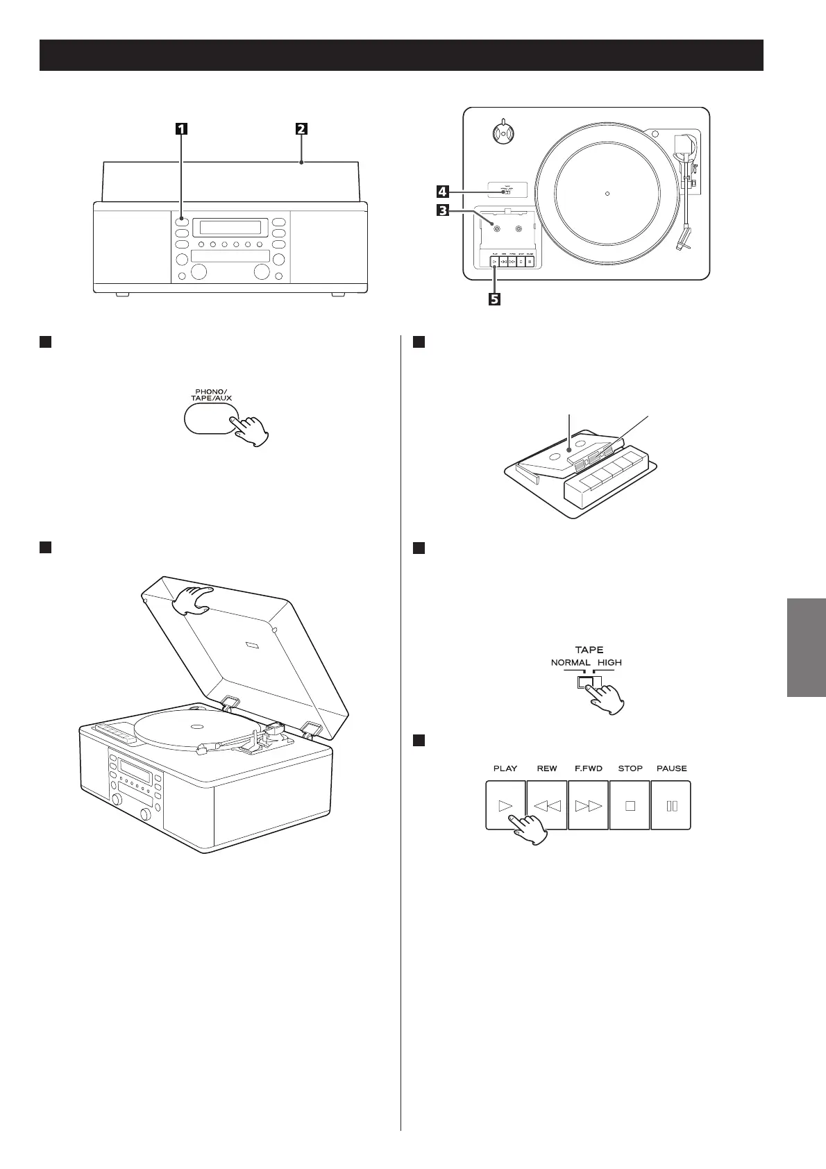 < Cada vez que pulse el botón PHONO/TAPE/AUX, será