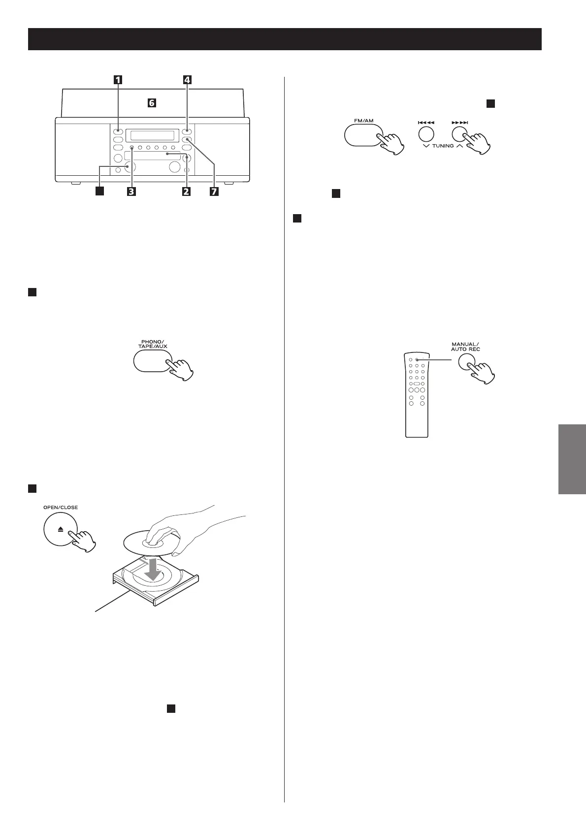 Pulse el botón PHONO/TAPE/AUX o el botón FM/AM