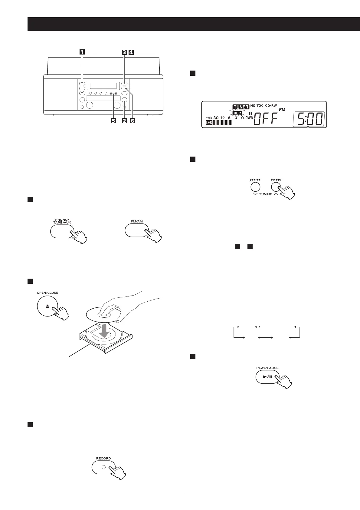 Press the PHONO/TAPE/AUX button or the FM/AM button