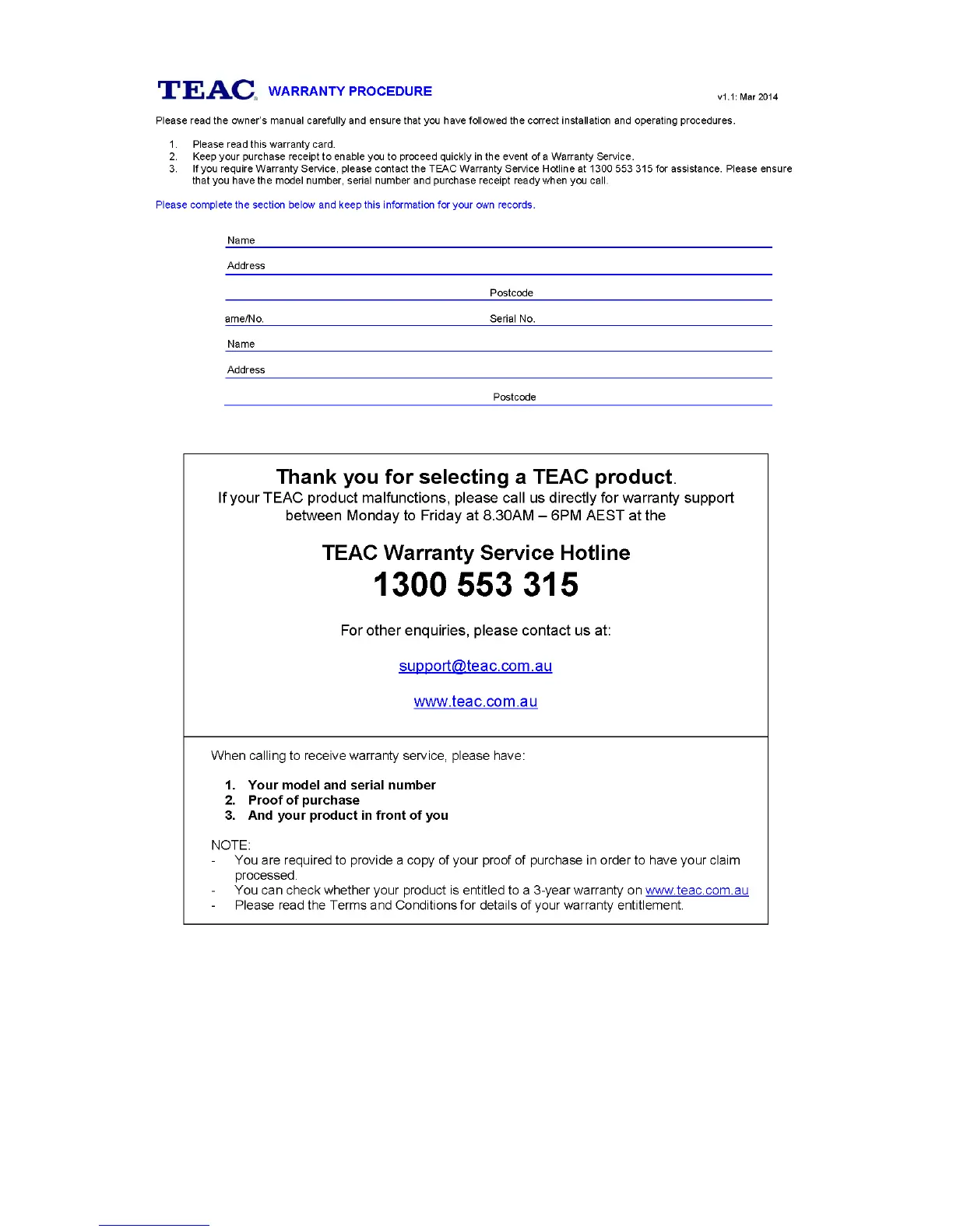 Teac LPU191 - TEAC Warranty Procedure and Support; Warranty Service Contact; Information Required for Service