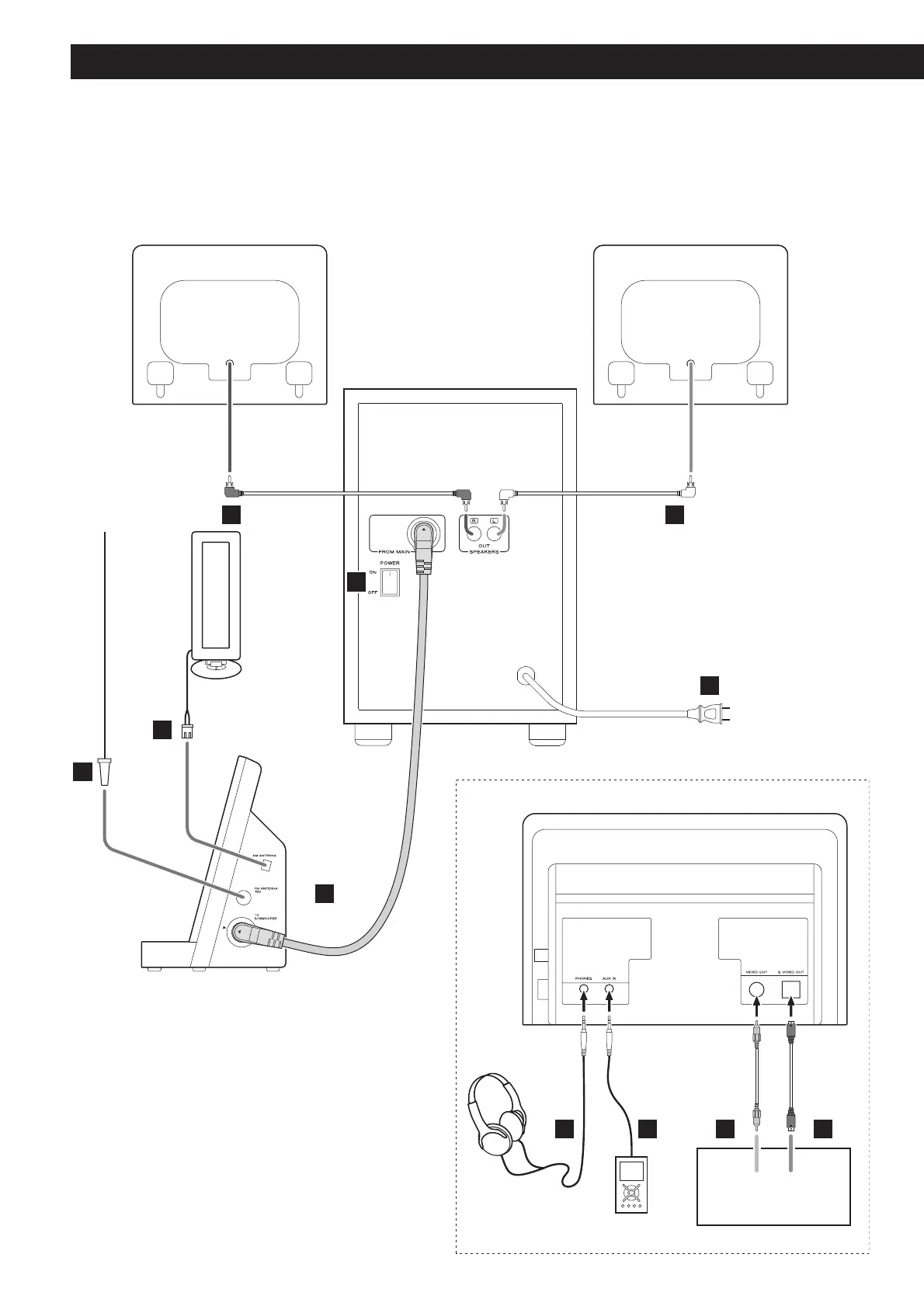 < Veillez à bien enfoncer chaque fiche de connexion. Pour éviter les bruits et les ronflements, ne