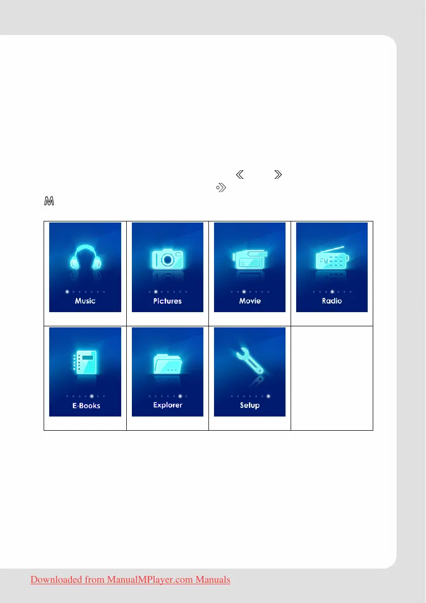 The main menu offers seven functions. and allow to navigate
