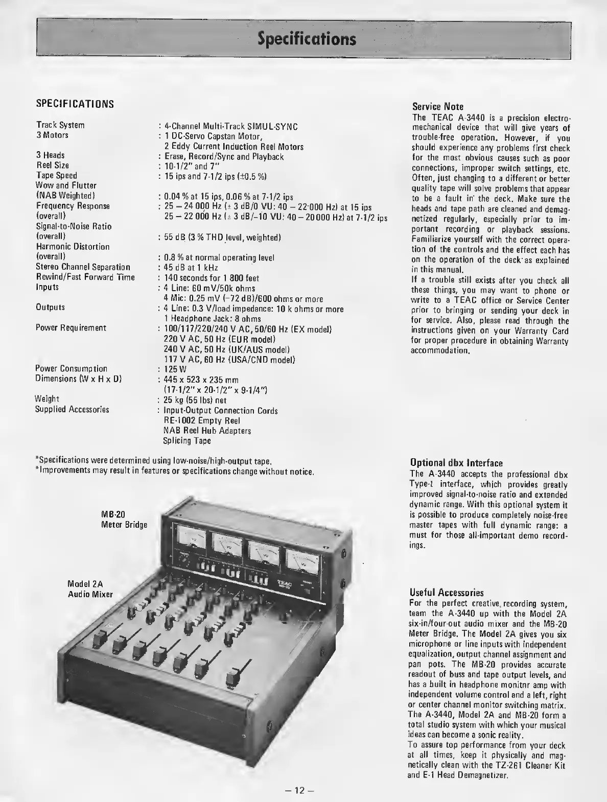Teac Multitrack Series - Specifications; Optional Dbx Interface; Useful Accessories; Service Note