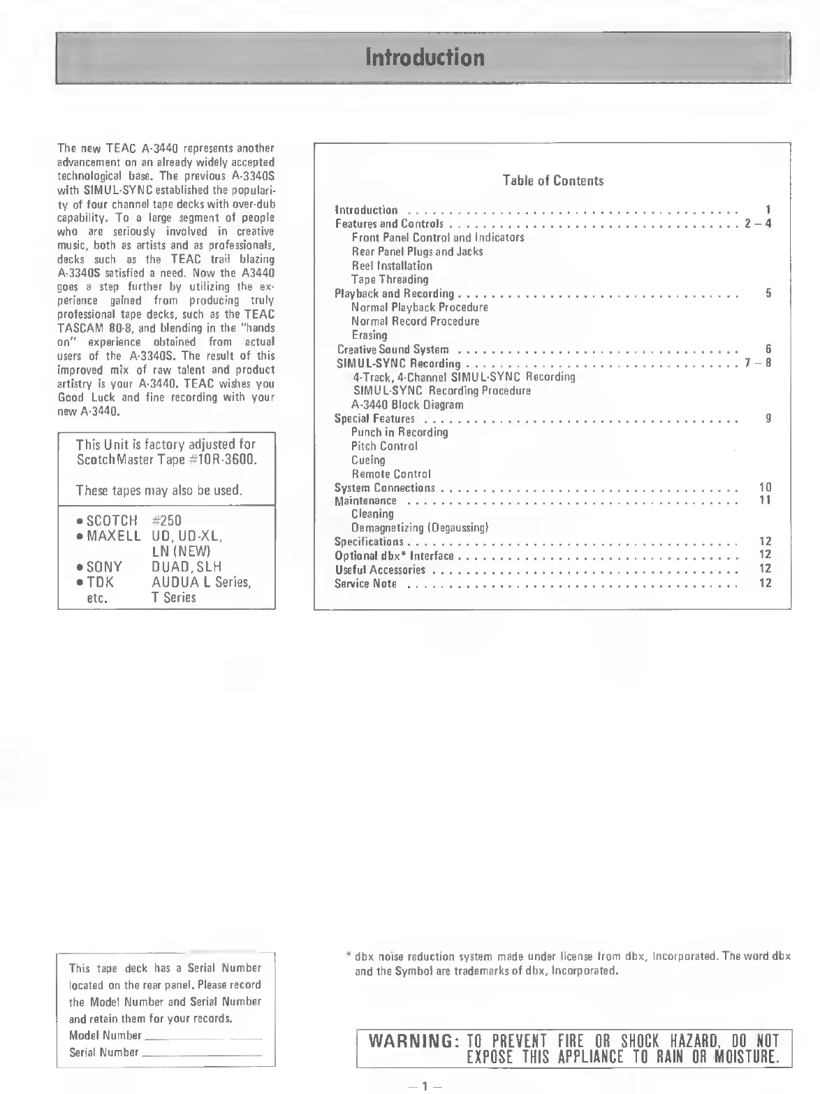 Teac Multitrack Series - Table of Contents