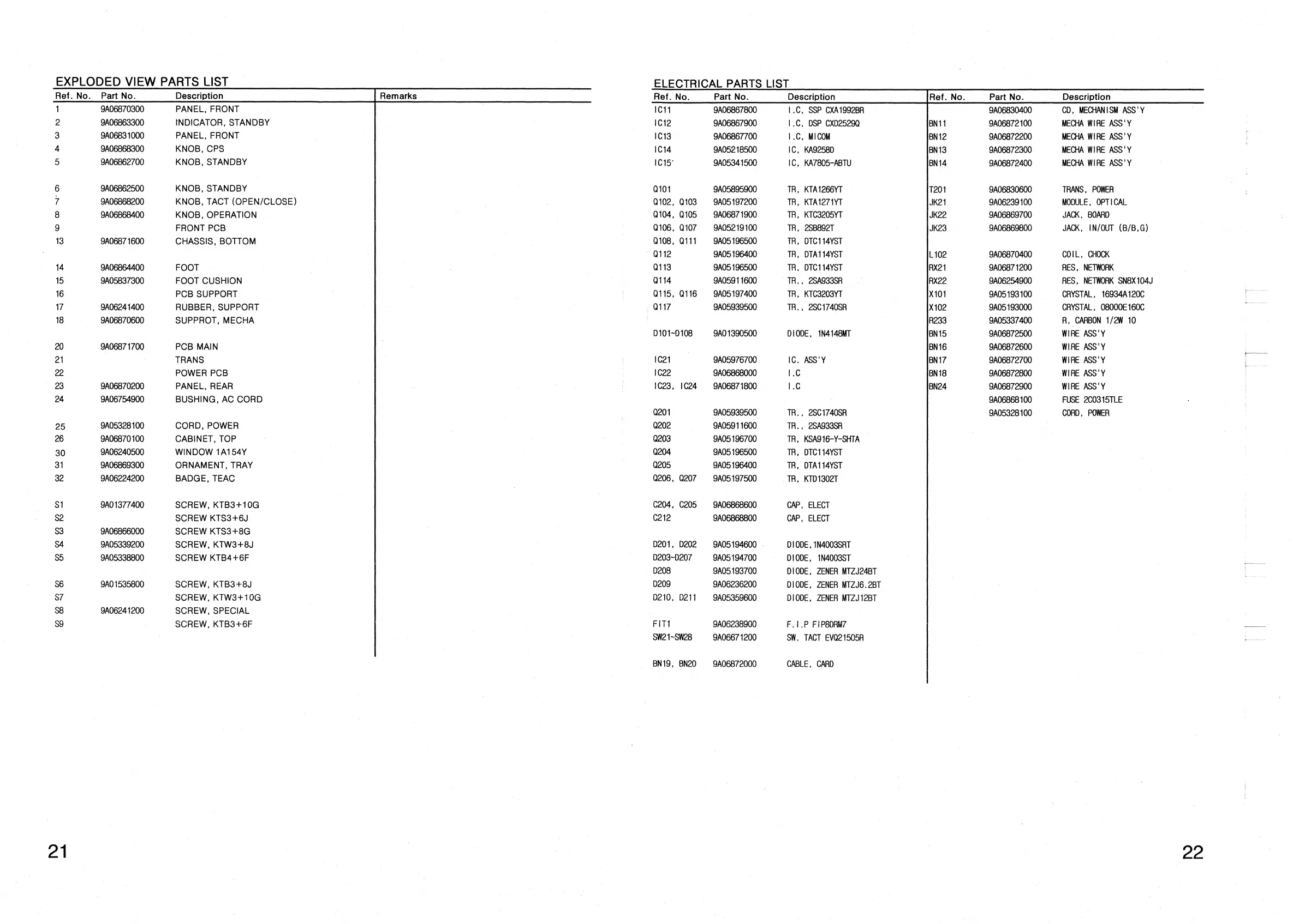 Teac PD-H300 - Exploded View Parts List; Electrical Parts List