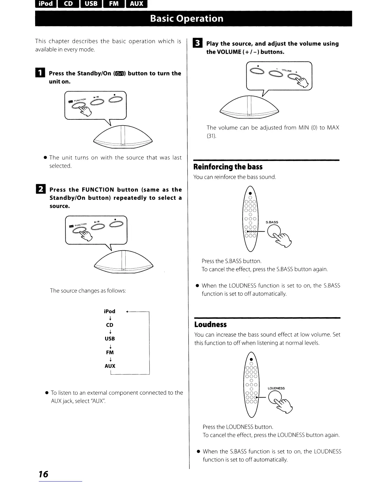 Teac SR-100i - Basic Operation; Power On and Source Selection; Volume and Sound Enhancement