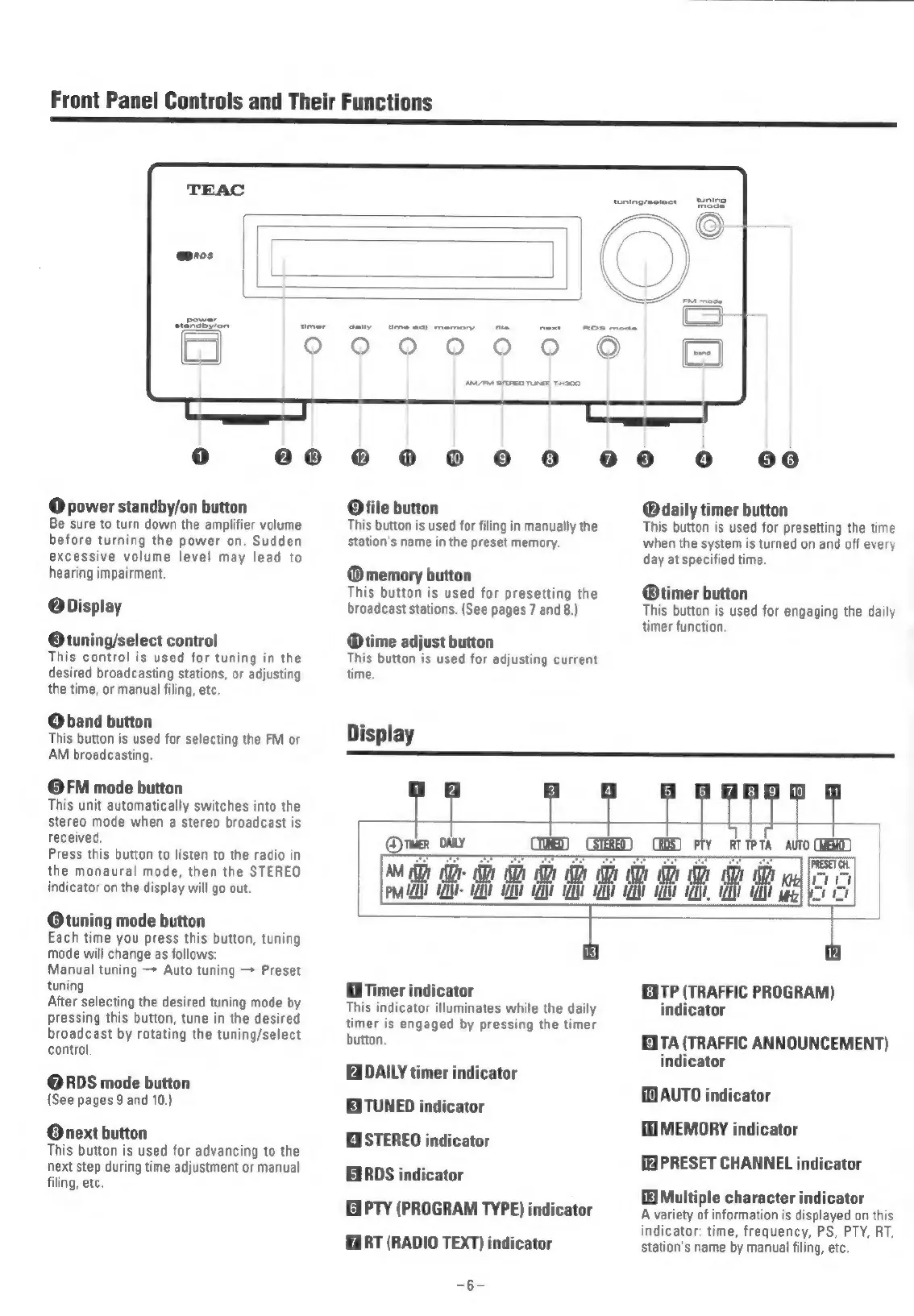 Teac T-H300 - Front Panel Controls and Functions; Key Controls and Buttons; Display Indicators Explained
