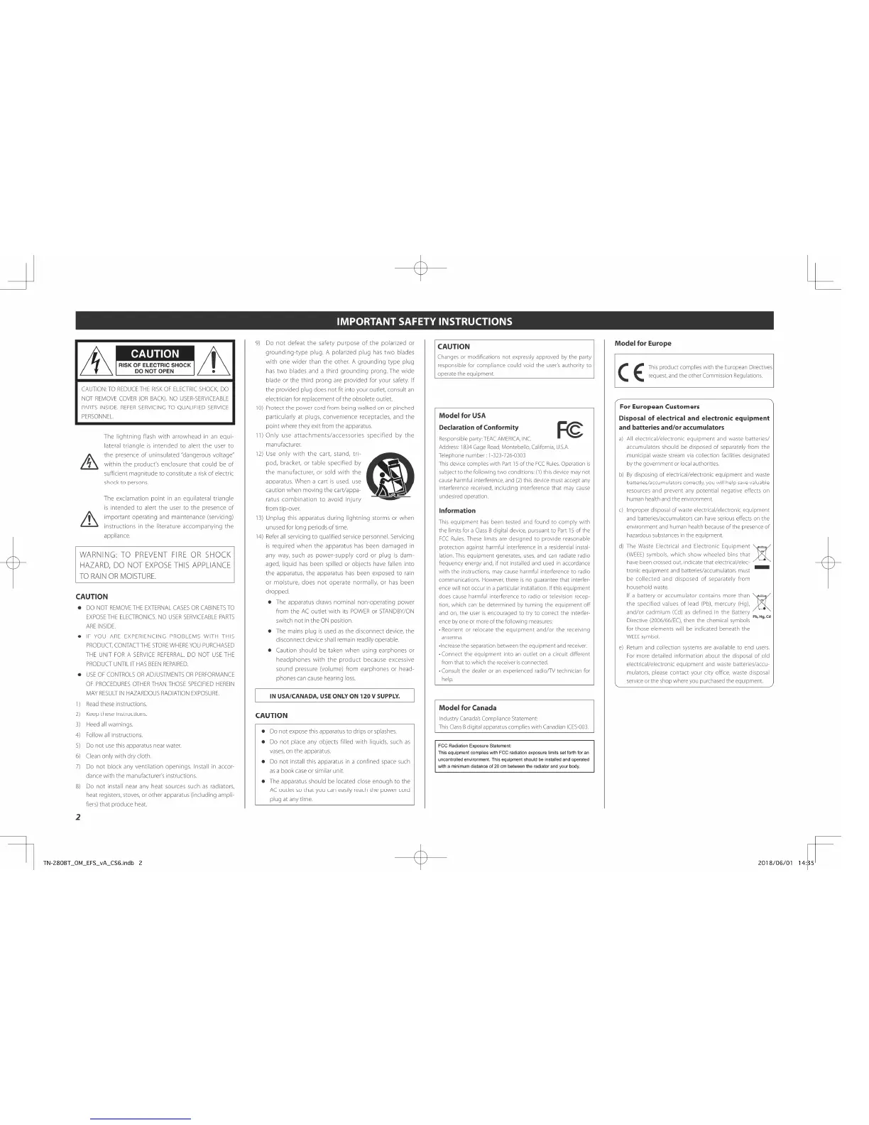 Teac TN-280BT - Important Safety Instructions; Electrical Safety and Shock Hazards; Environmental and Usage Precautions; Plug, Cord, and Servicing Guidelines