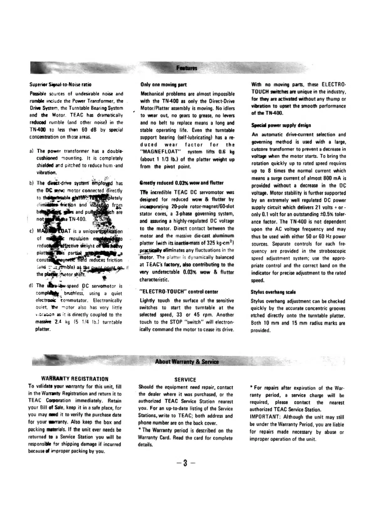 Teac TN-400 - Features; Superior Signal-to-Noise Ratio; Only One Moving Part; Reduced Wow and Flutter