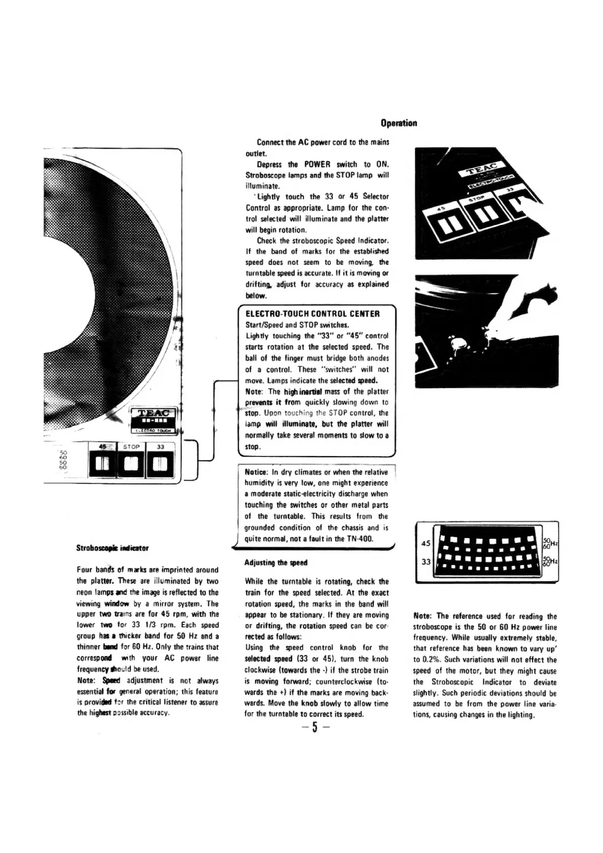 Teac TN-400 - Operation; Electro-Touch Control Center; Adjusting the Speed