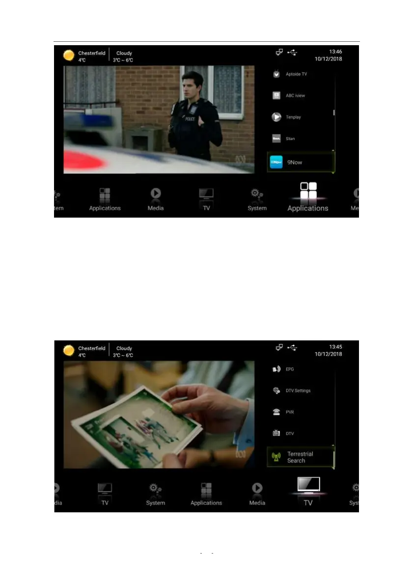 ● Press ◀ / ▶ to scroll through the different menus: TV, Media, Applications, System.