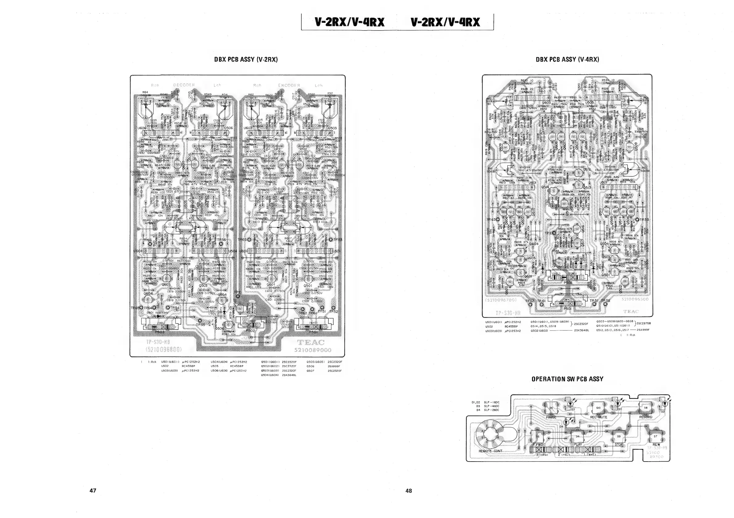 Teac V-2RX - PC Boards and Parts Lists (Cont.); DBX PCB Layout (V-2 RX); DBX PCB Layout (V-4 RX); Operation PCB Layout