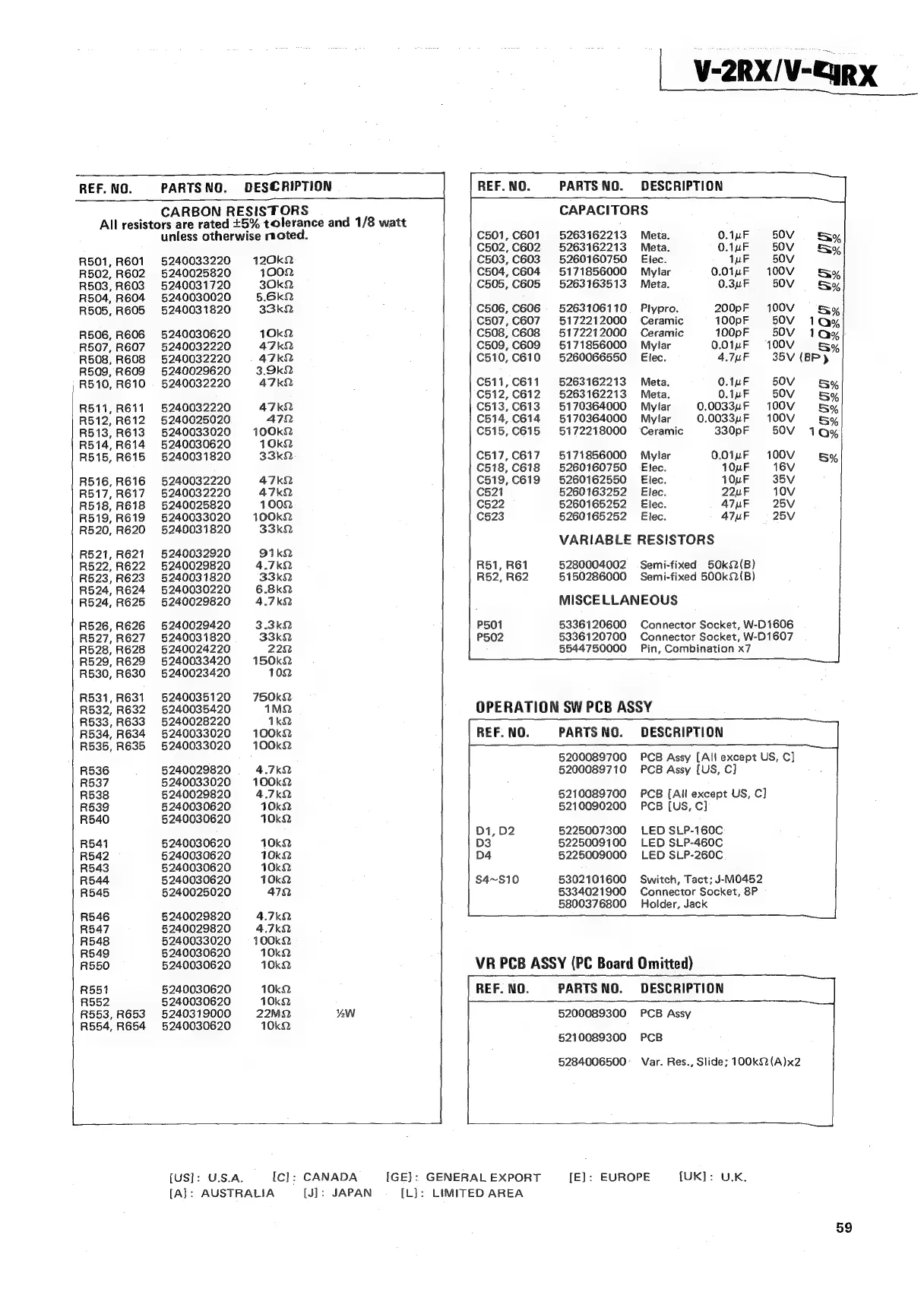 Teac V-2RX - Operation Switch PCB Component List; VR PCB Component List