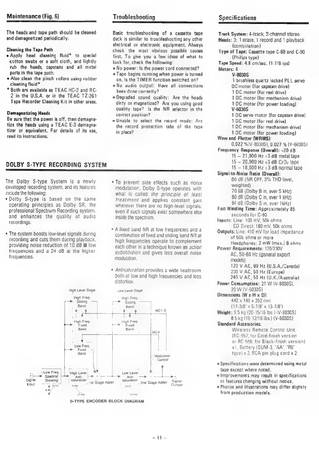 Teac V-8030S - Troubleshooting; Specifications
