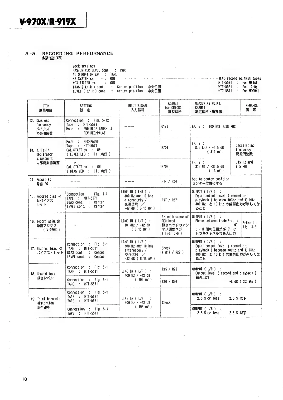 Teac V-970X - 5-5 Recording Performance; Bias Oscillator Frequency and Adjustment; Record EQ and Bias Settings; Record Azimuth and Bias Adjustment