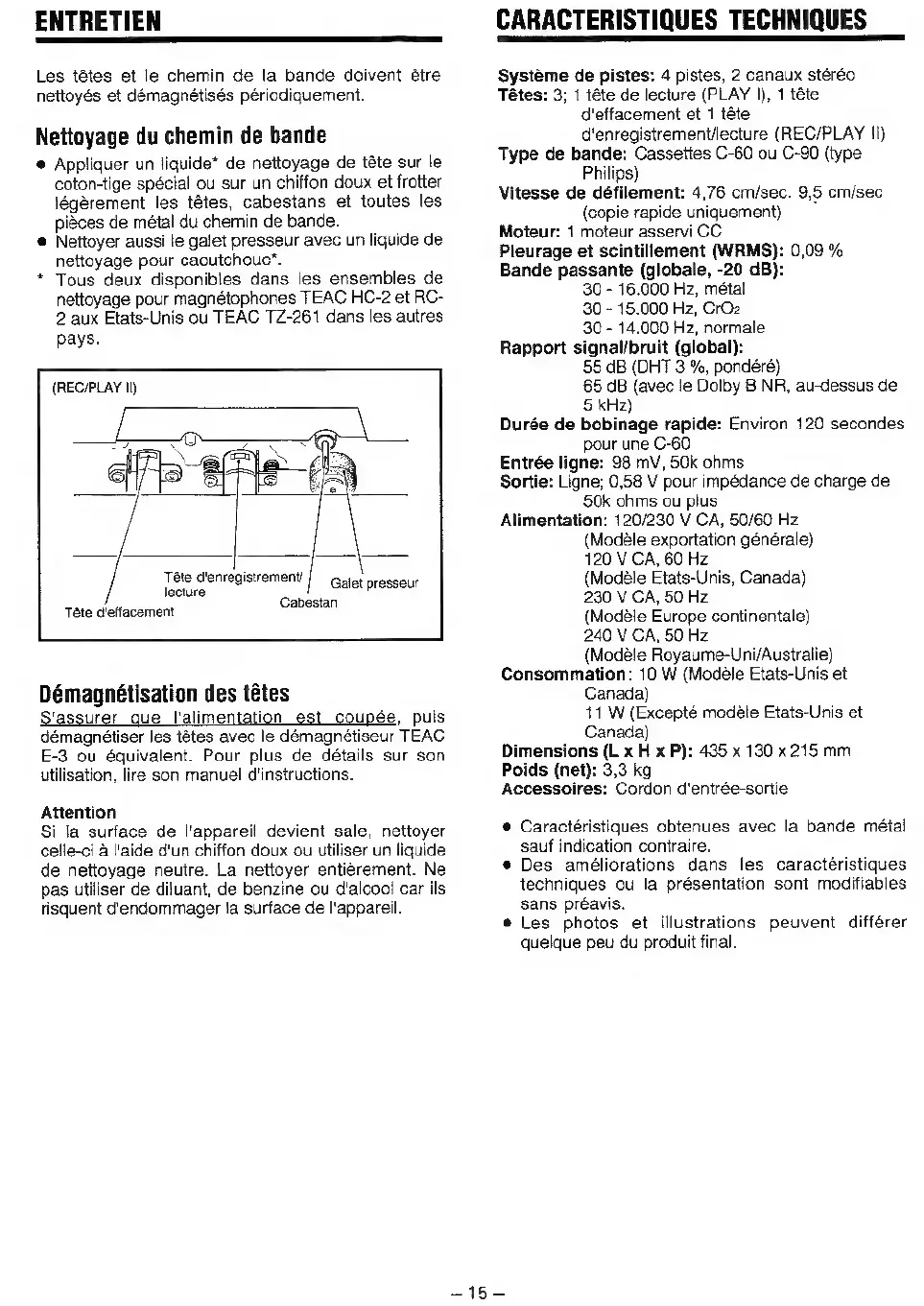 Teac W-415 - Entretien; Caracteristiques Techniques