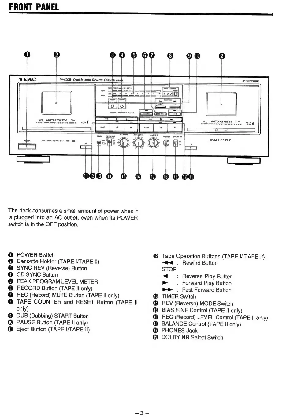 Teac W-520R - Front Panel