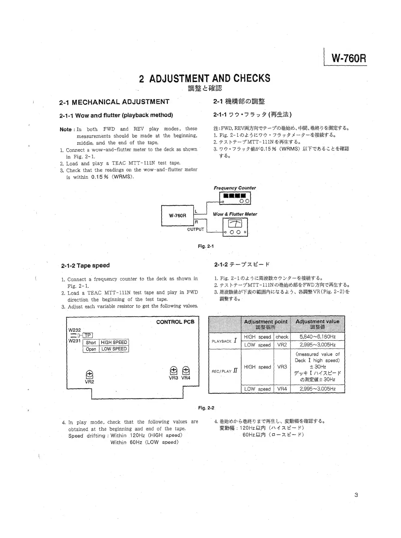 Teac W-760R - Adjustment and Checks; 2-1 Mechanical Adjustment; Wow and Flutter Measurement; Tape Speed Adjustment