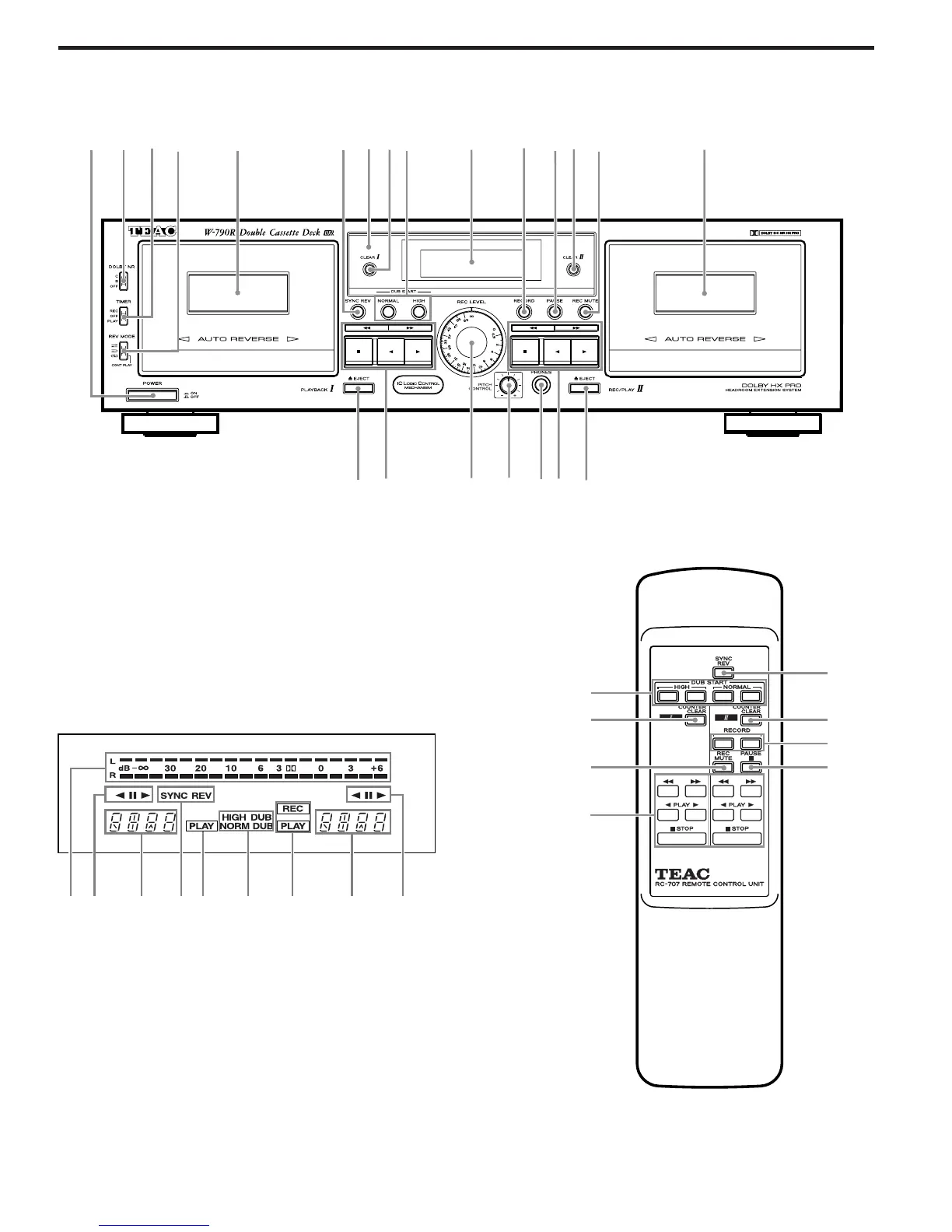 Teac W-790R - Front Panel and Remote Control Layout; Front Panel Controls; Remote Control Unit Overview; Display Window Indicators