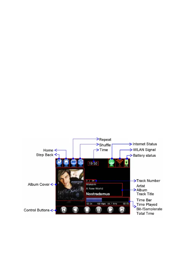 Pokud se přehrává skladba, zobrazí se na displeji Přehrávání: