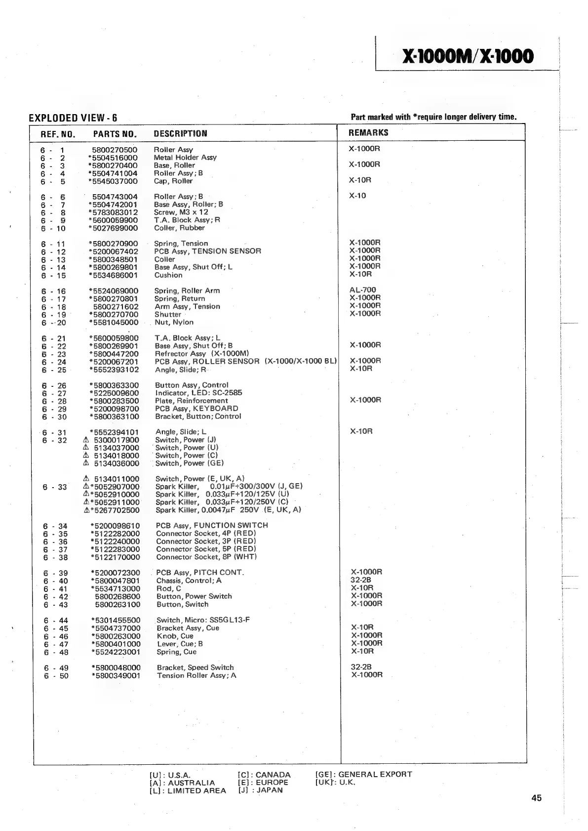 Teac X-1000M - Exploded View-6 Parts List; Parts List for Exploded View-6