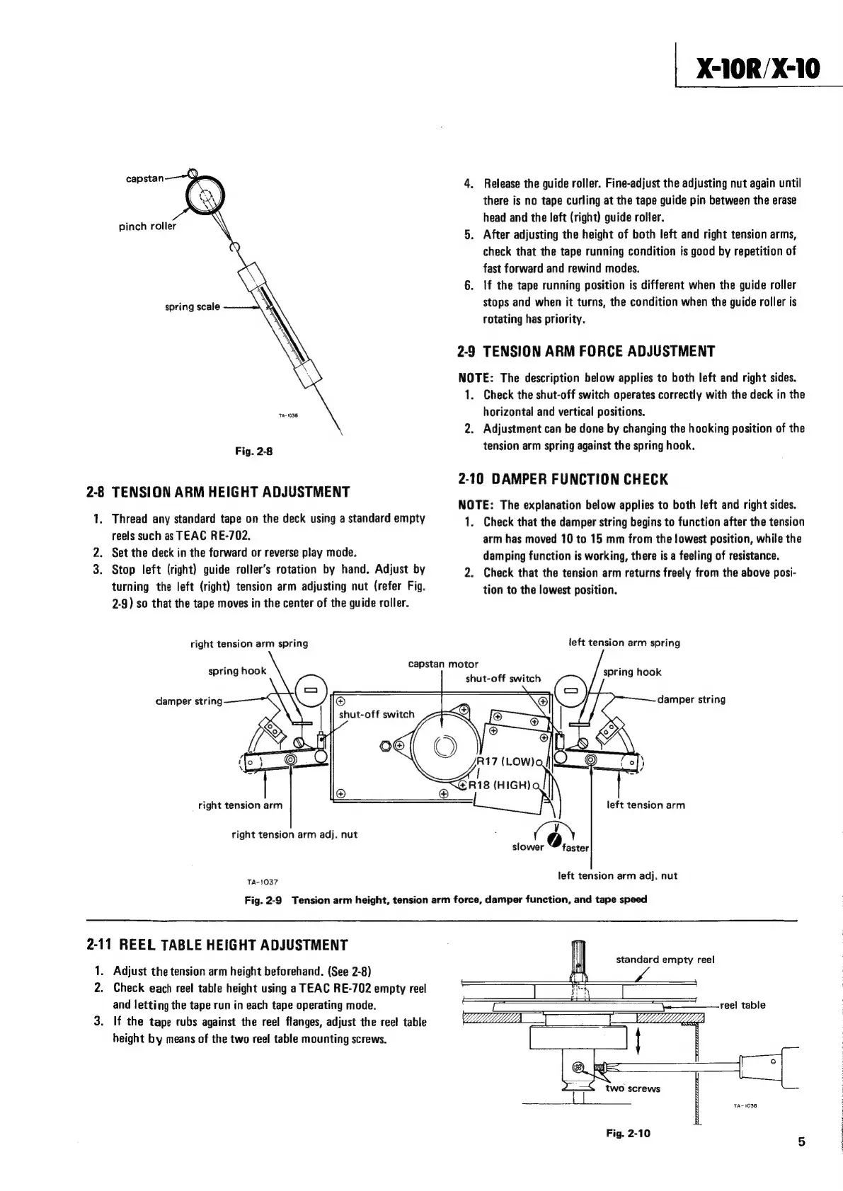 Teac X-10R - 2-8 Tension Arm Height Adjustment; 2-9 Tension Arm Force Adjustment; 2-10 Damper Function Check; 2-11 Reel Table Height Adjustment
