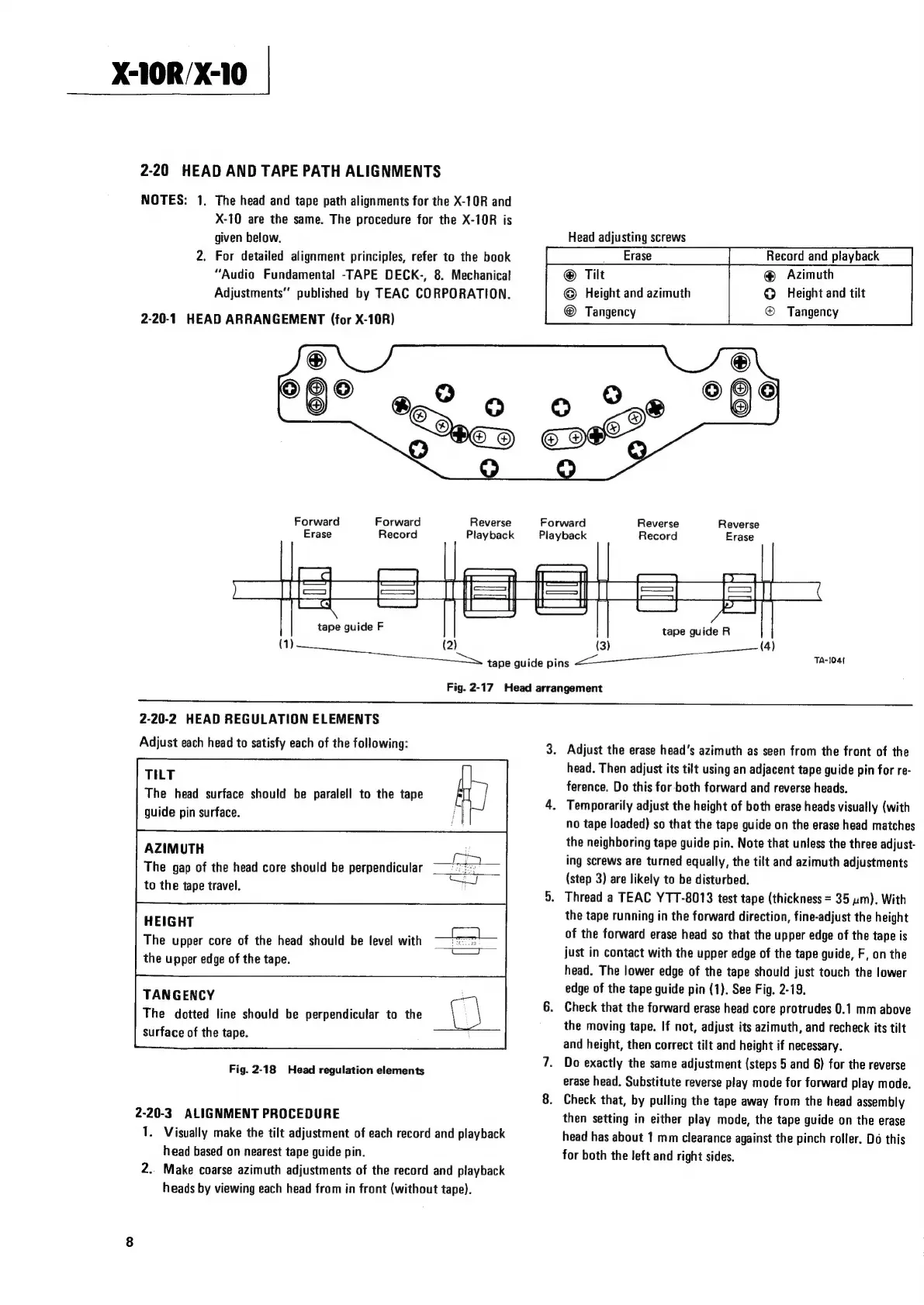 Teac X-10R - 2-20 Head and Tape Path Alignments; 2-20-1 Head Arrangement Overview (X-10 R); 2-20-2 Head Regulation Elements; 2-20-3 Alignment Procedure Guide