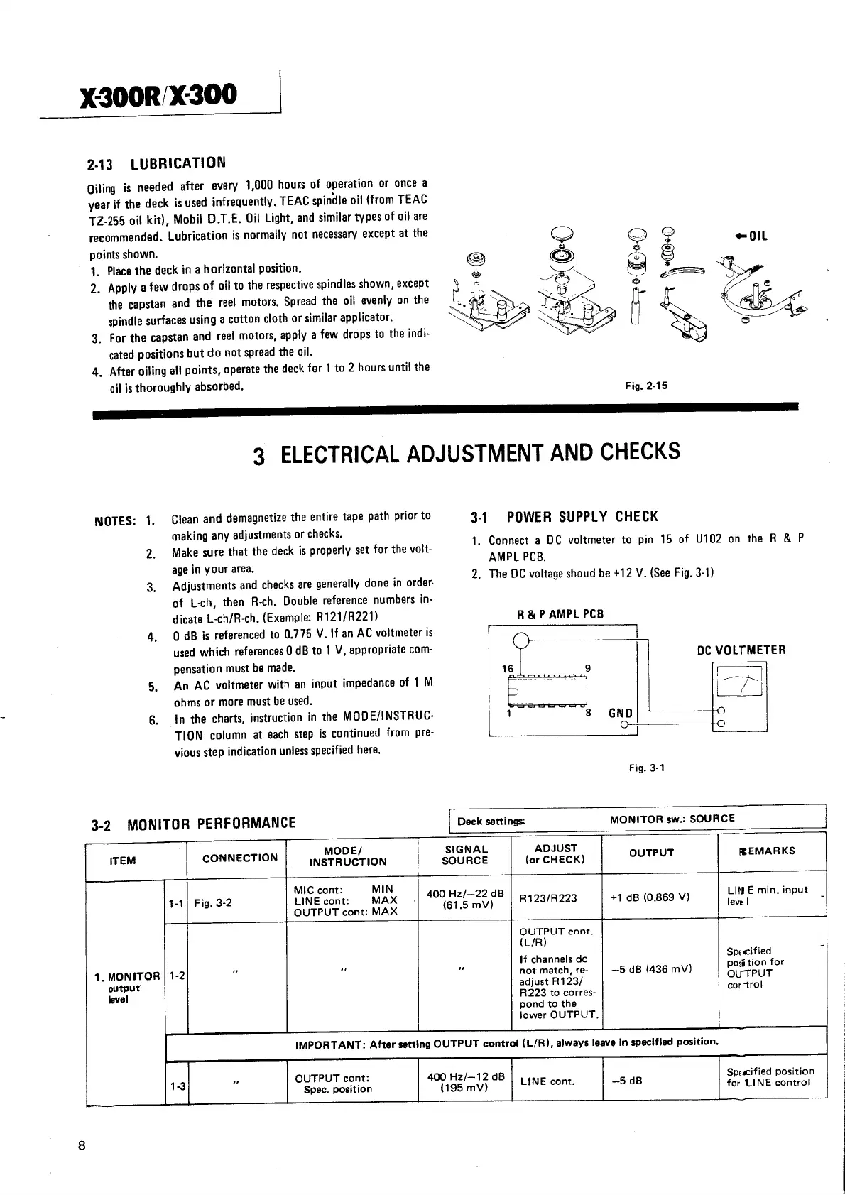 Teac X-300 - 3 Electrical Adjustment and Checks; 3-1 Power Supply Check; 3-2 Monitor Performance