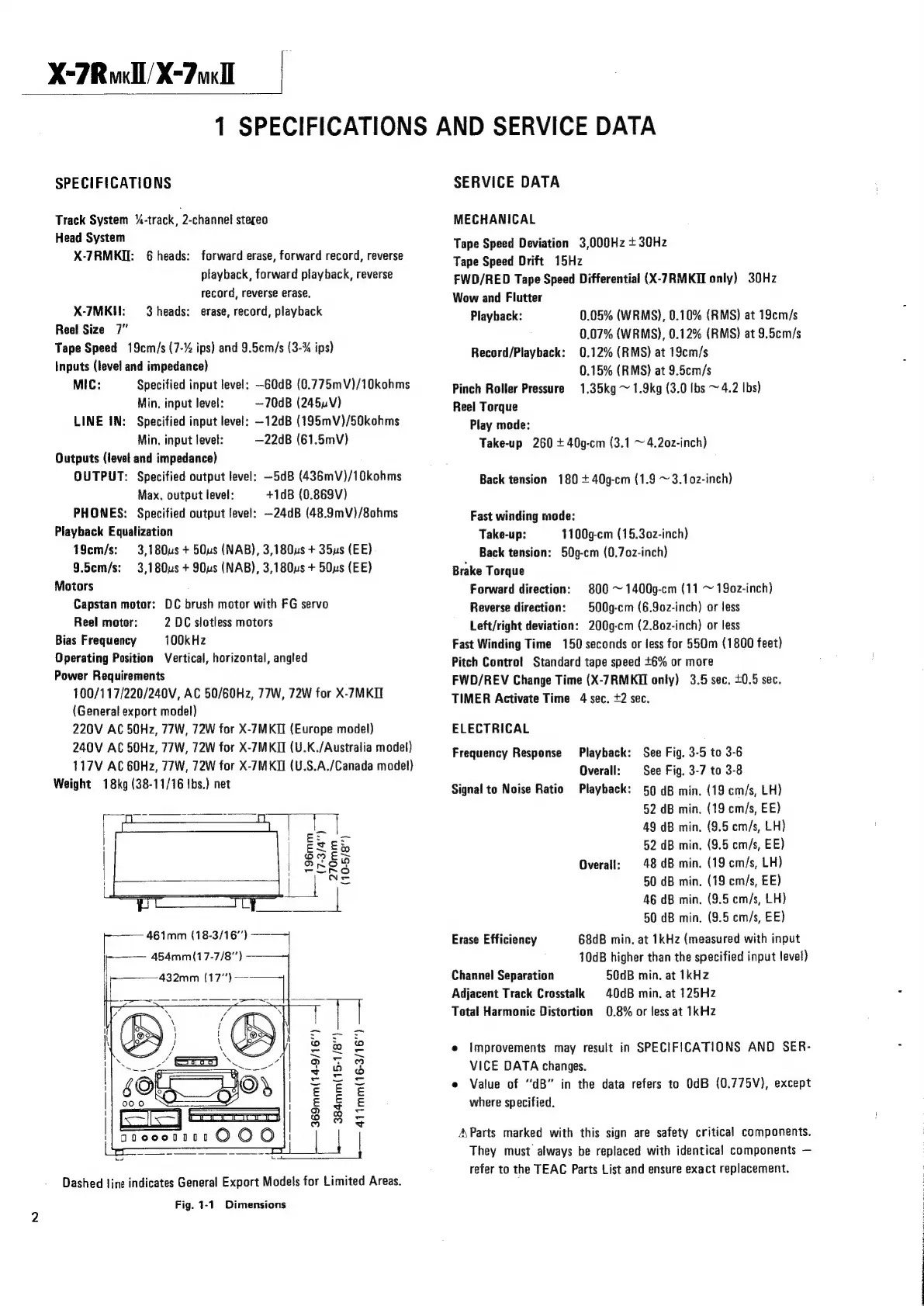 Teac X-7RMKII - 1 SPECIFICATIONS AND SERVICE DATA; Specifications and Service Data