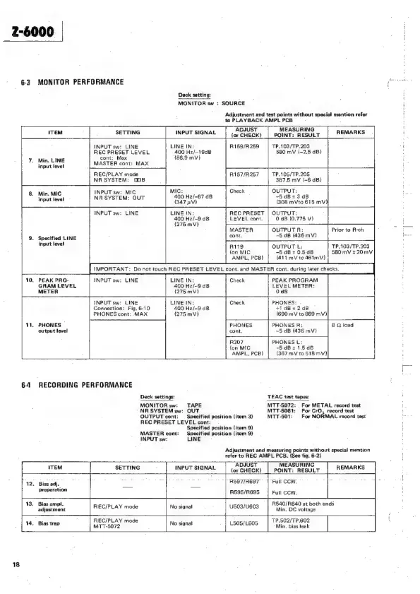 Teac Z-6000 - 6-3 MONITOR PERFORMANCE; 6-4 RECORDING PERFORMANCE