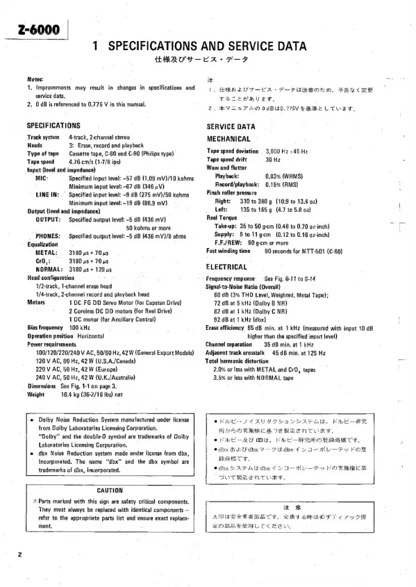Teac Z-6000 - 1 SPECIFICATIONS AND SERVICE DATA; Specifications; Service Data; CAUTION