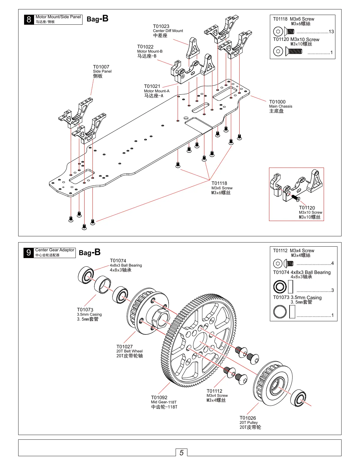 Team C TC10 - Chassis and Mounts Assembly; Motor Mount and Side Panel Installation; Center Gear Adaptor Installation