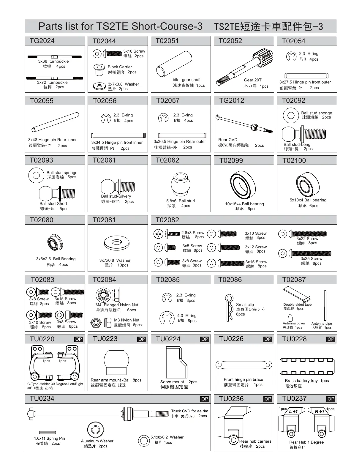 Parts list for TS2TE Short-Course-3