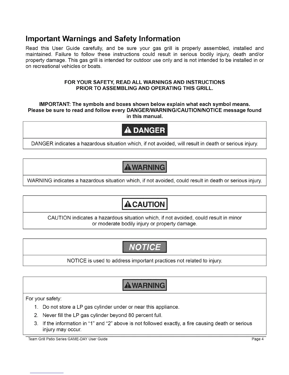 Team Grill Patio Series GAME-DAY User Guide Page 4