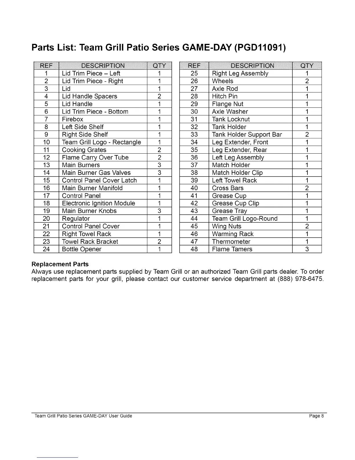 Parts List: Team Grill Patio Series GAME-DAY (PGD11091)