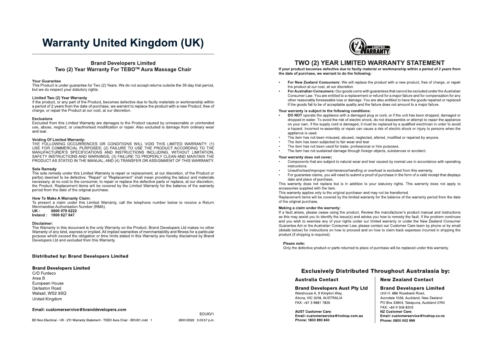 TEBO AURA - Warranty Statement; Two-Year Limited Warranty
