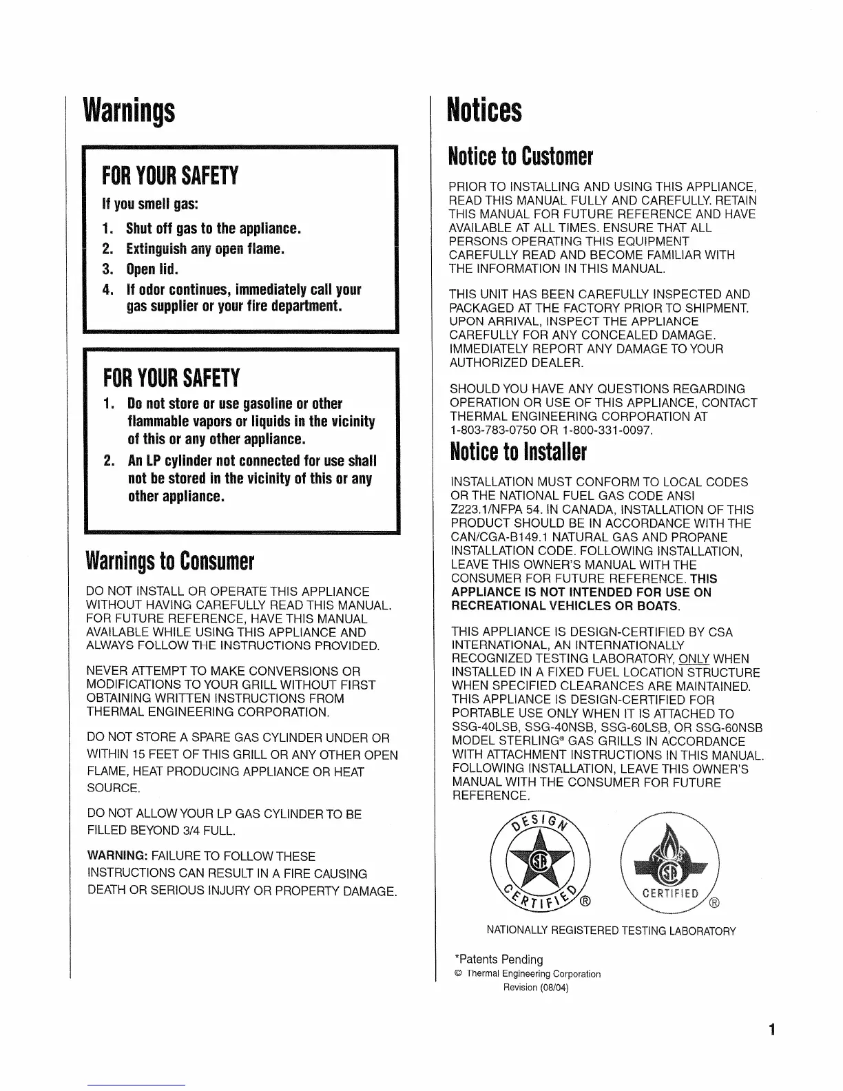 TEC Sterling - Warnings and Notices; For Your Safety; Warnings to Consumer