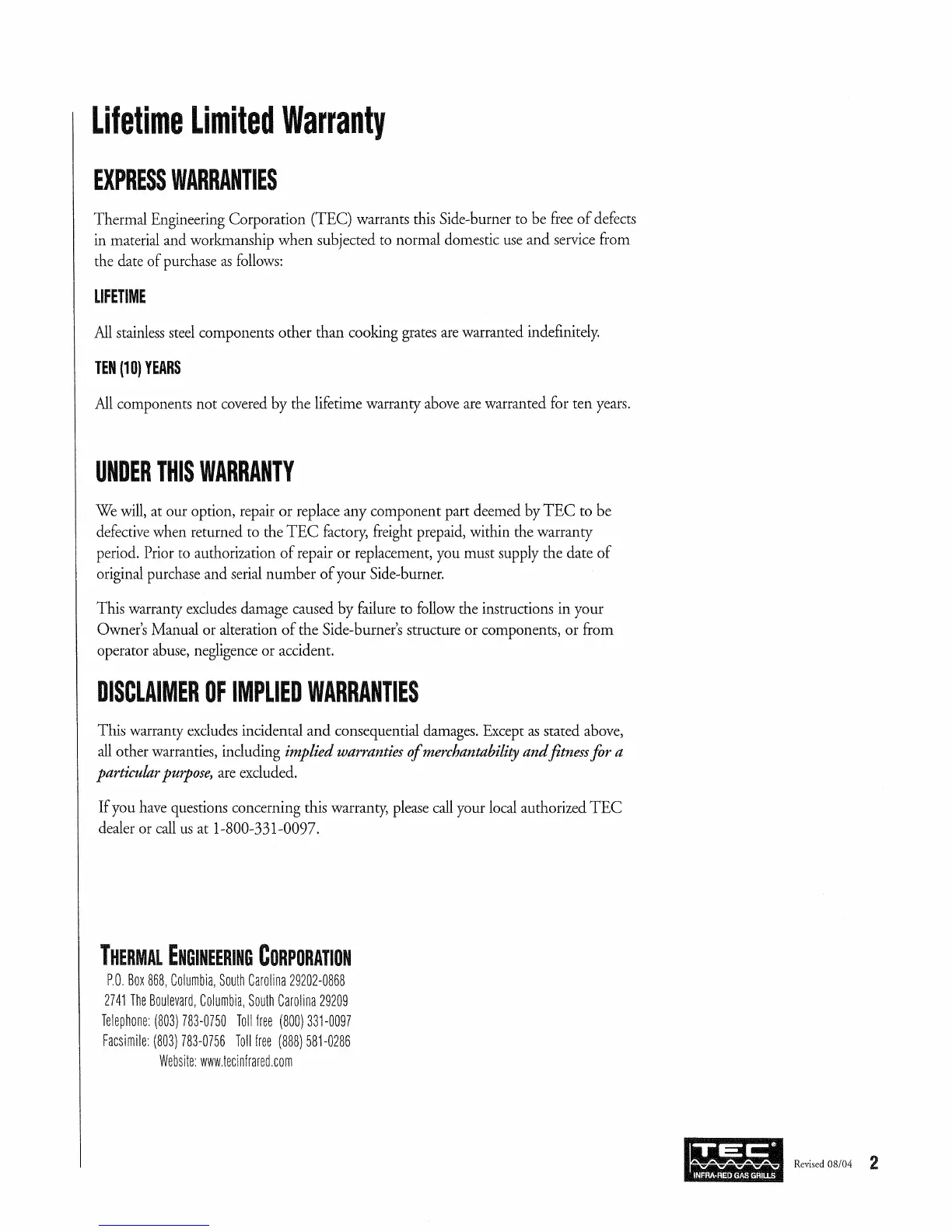 TEC Sterling - Lifetime Limited Warranty; Express Warranties; Under This Warranty