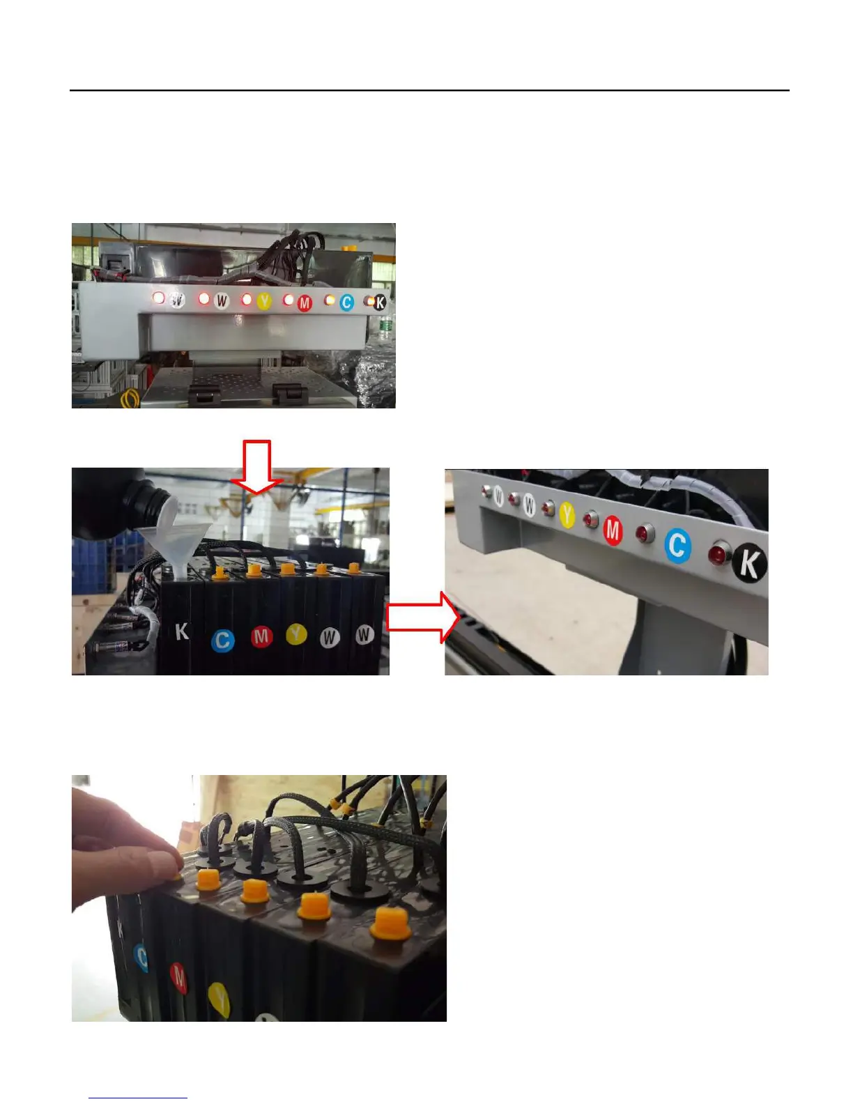 1. Open the ink tank cover, Fill the ink to the ink tank according to the ink mark at the ink tank by the funnel, different ink fill