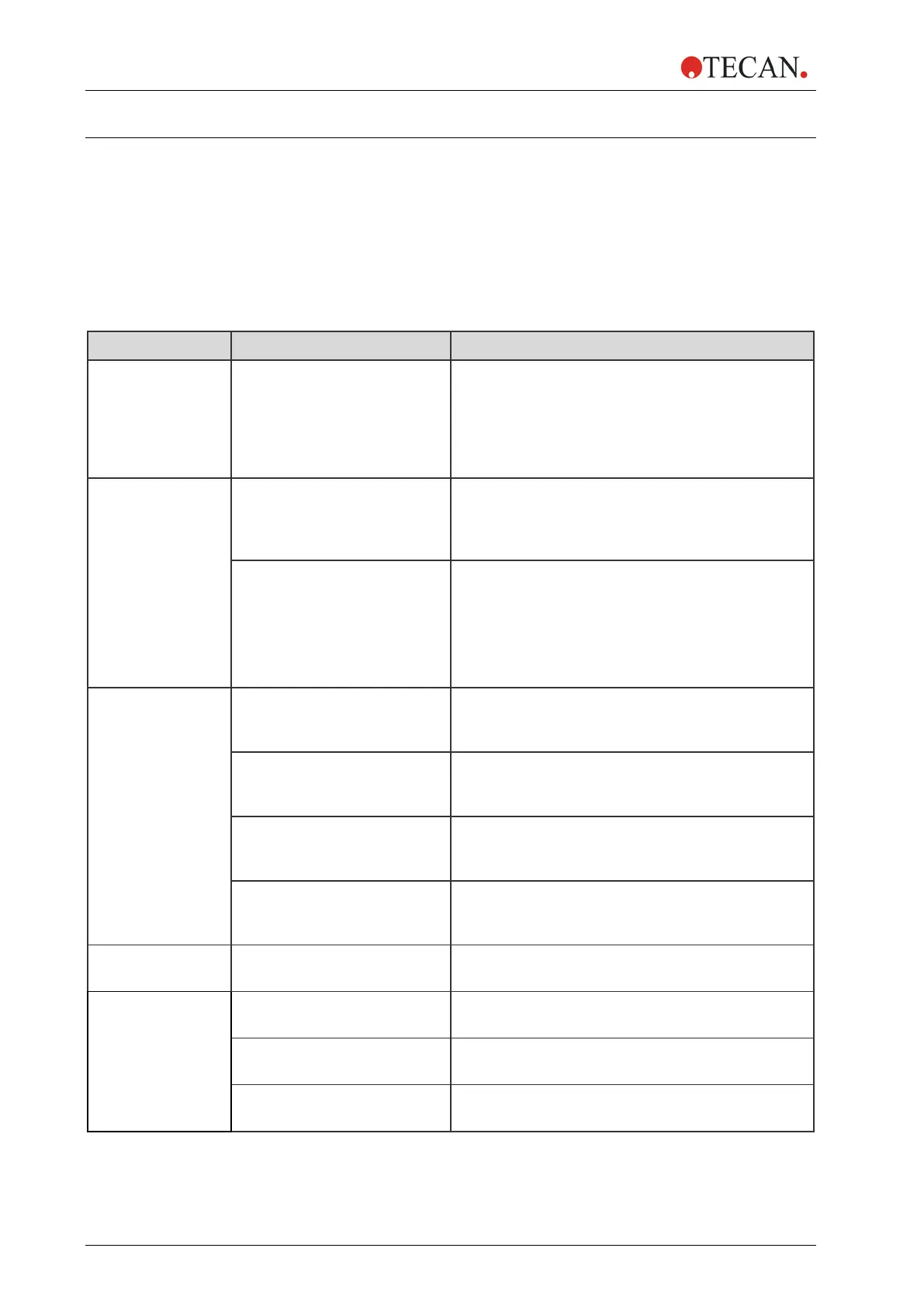 errors, the Corrective Measures column directs you to contact the local Tecan
