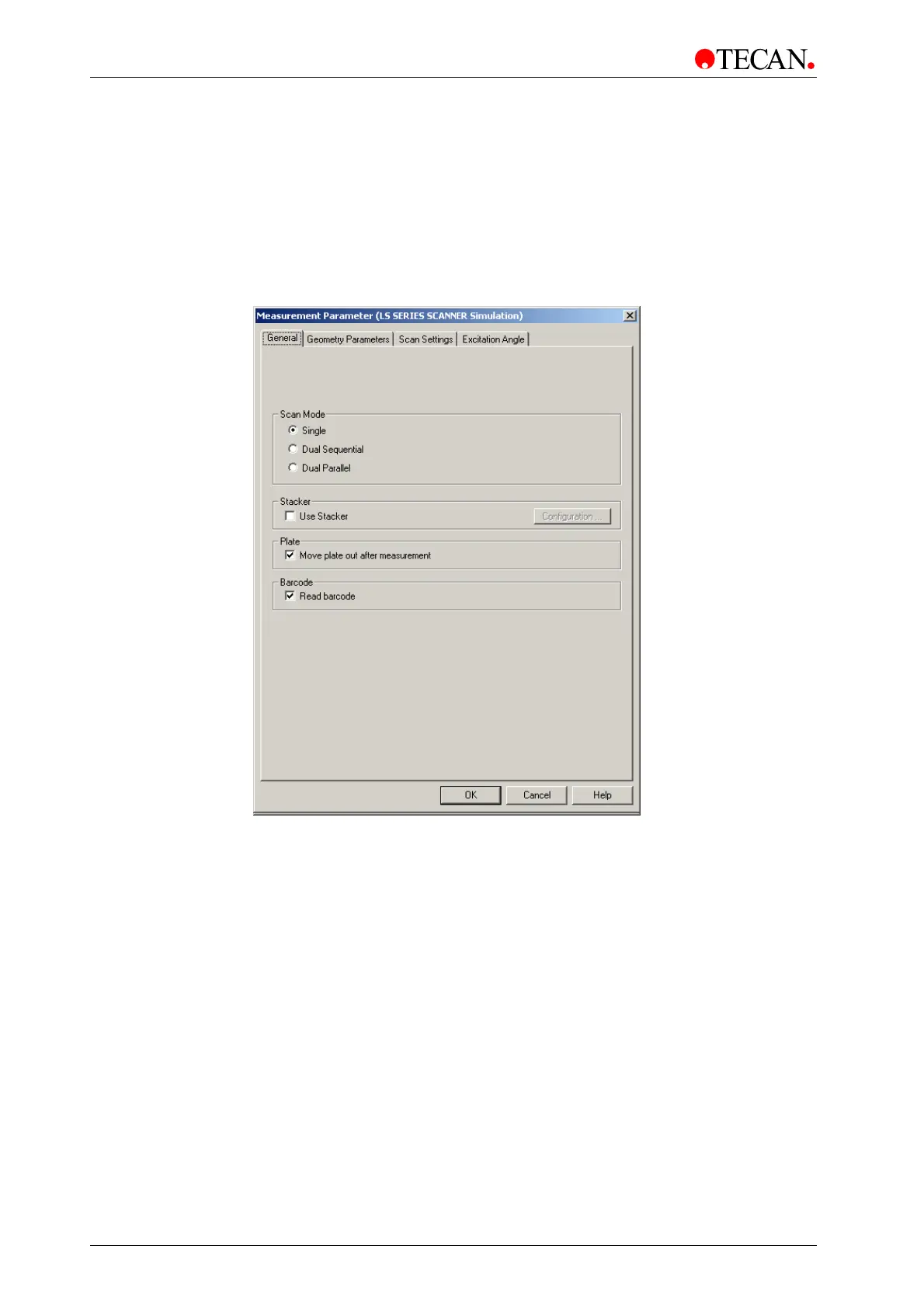 Scan Mode, Stacker and/or Barcode as well as define Geometry Parameters,