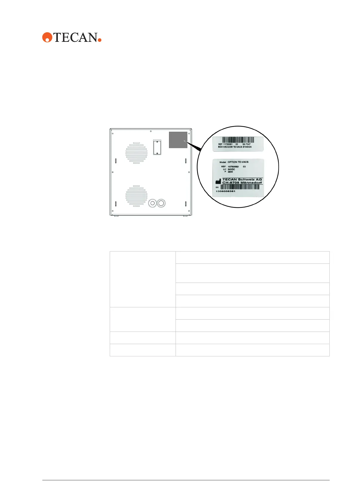 The type plate is on the rear side of the Te-VacS and contains the following