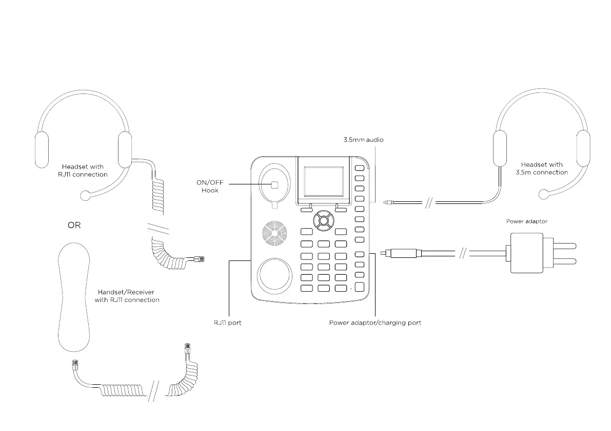 5. Connect one end of the power adaptor to the phone’s power adaptor/ charging port.