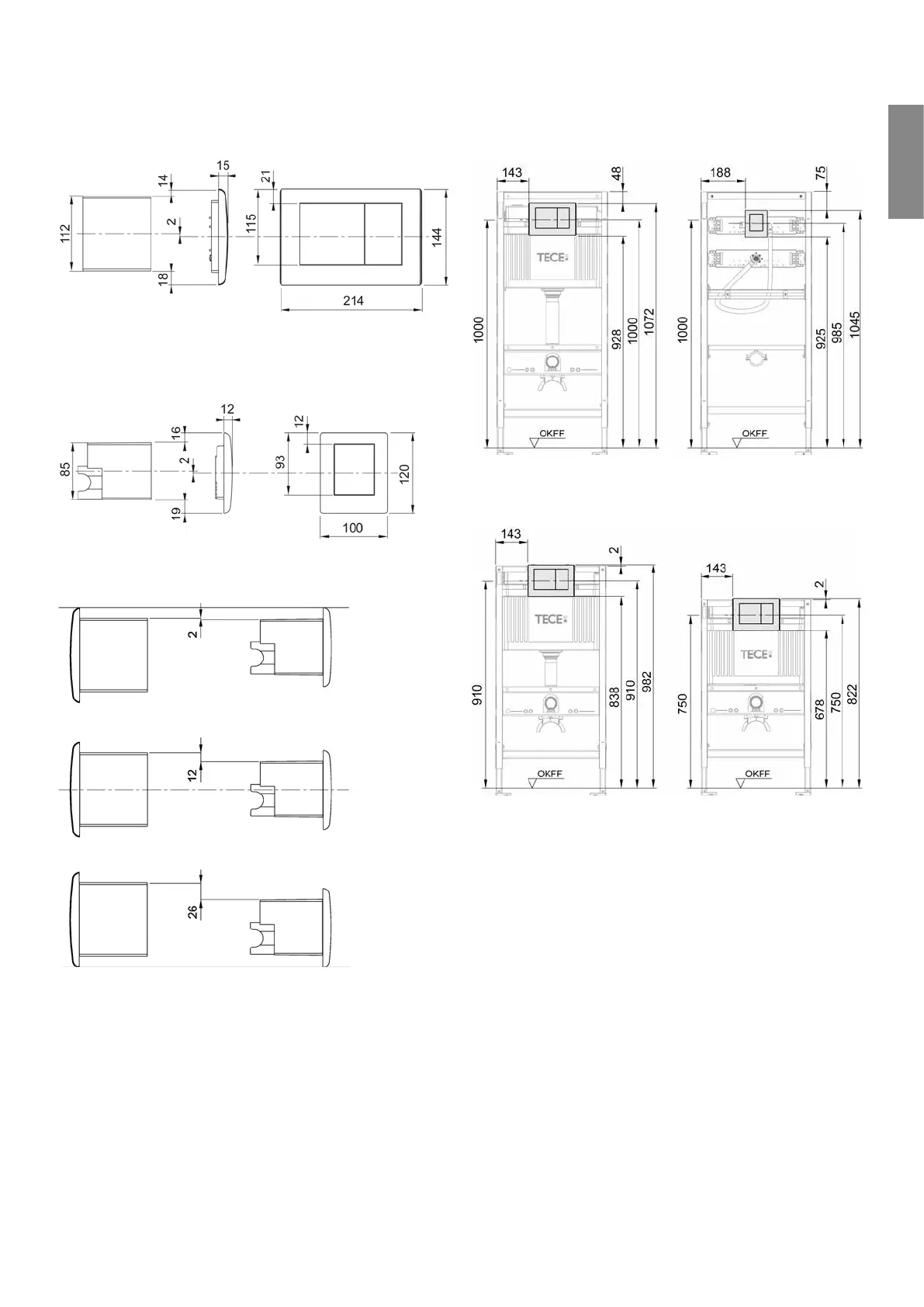 Dimensions of toilet flush plate and bare-wall protection for vertical slot alignment