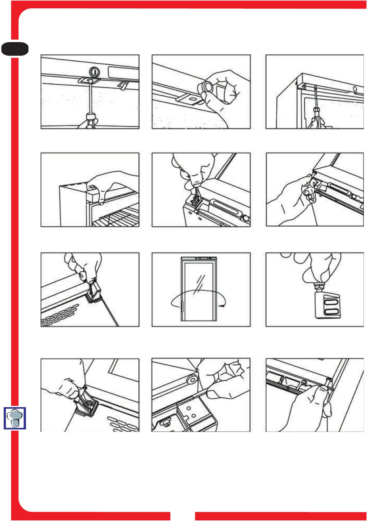 7. Togliere la cerniera inferiore 8. Spostare sull'altro lato la maniglia.