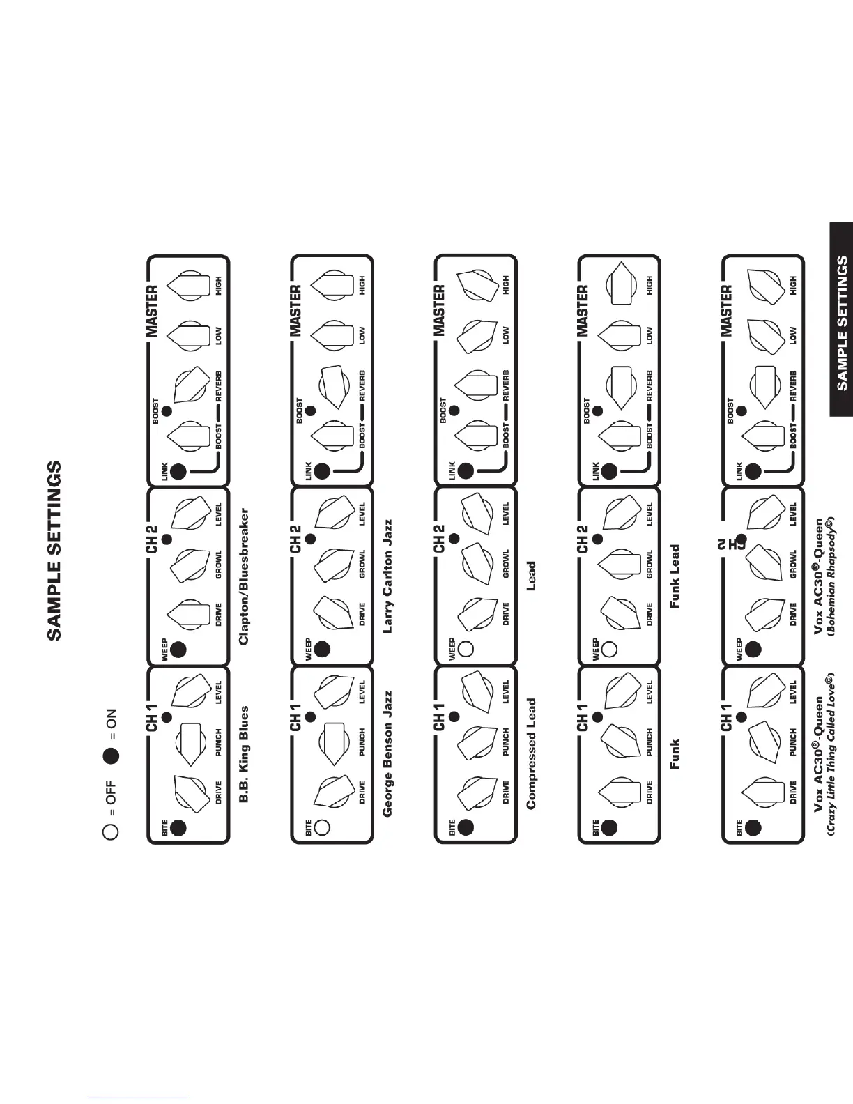 Tech 21 Trademark 60 - Sample Settings (Continued); Blues and Jazz Settings; Lead and Funk Settings; Vox AC30 Emulation Settings