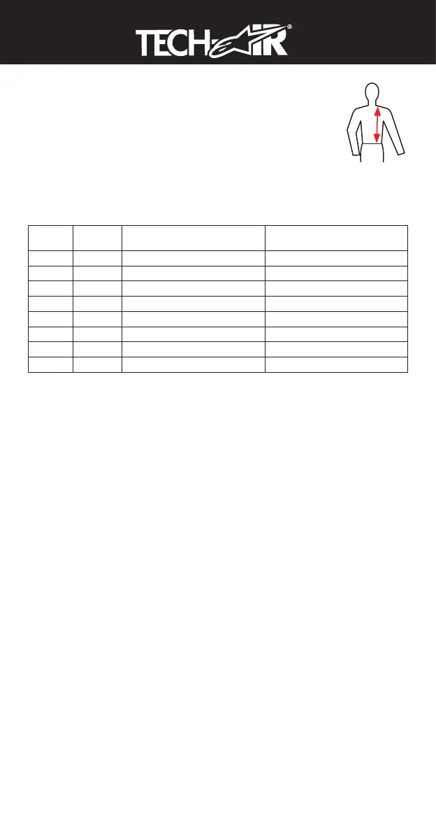 elenca le taglie del Sistema, la distanza dalla vita alla spalla e l’altezza