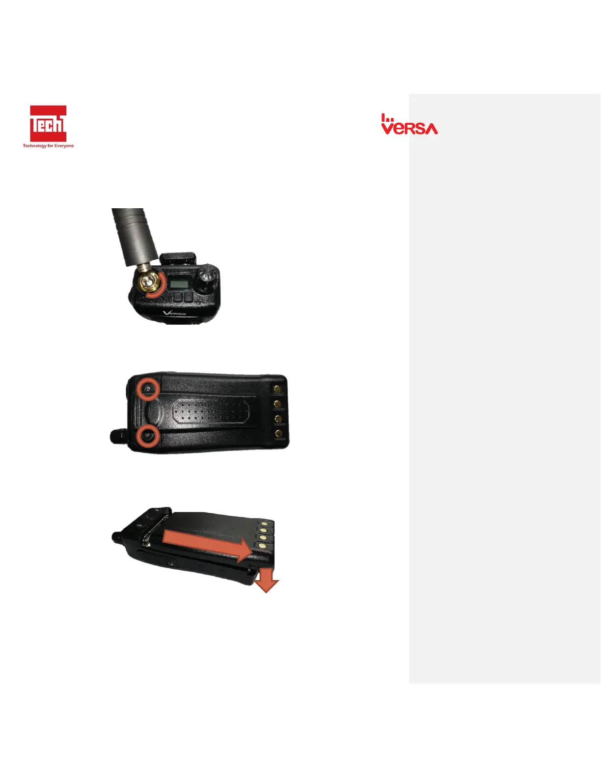 3. Remove the battery. Press down the battery latch at the bottom of the transceiver then