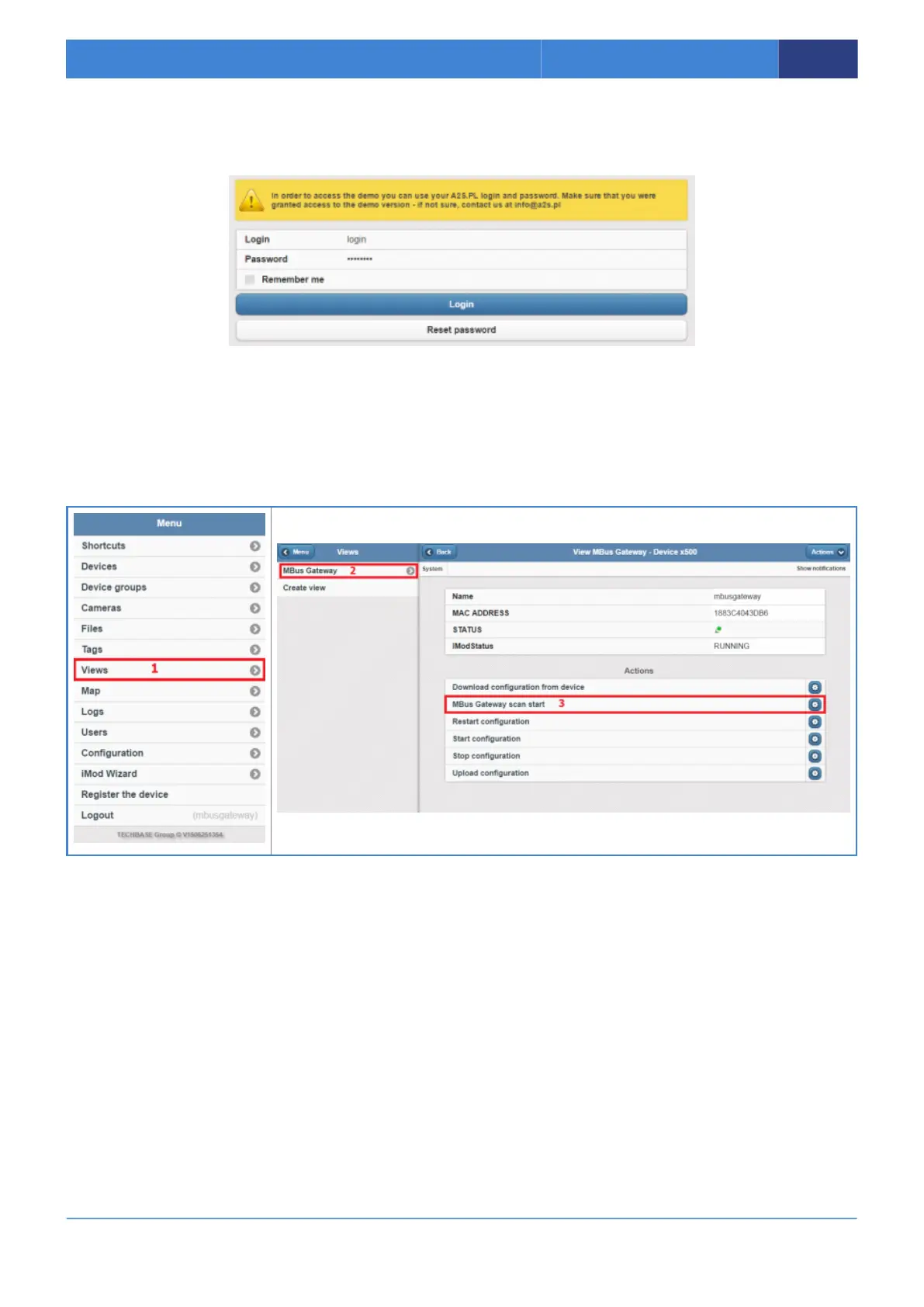 Go to MBus Gateway view (1,2) and run MBus Gateway scan start action (3).