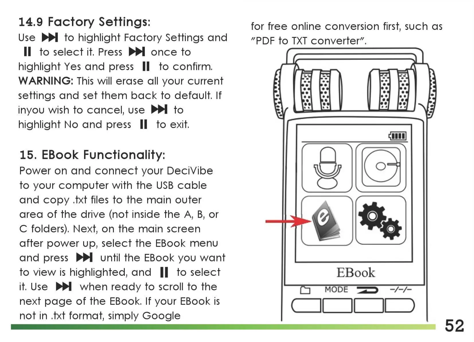 Techerific DeciVibe - Resetting to Factory Settings; EBook Reader Functionality; EBook File Loading and Reading